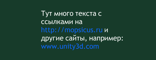 Пускай у нас есть компонент ТМР с текстом, в котором встречаются ссылки на страницы в сети, например: http://mopsicus.ru, www.unity3d.com, и другие. И нужно чтобы это выглядело примерно так, и было кликабельно: